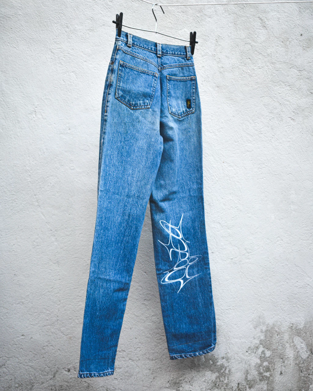 Calça jeans de cintura alta. Peça vintage estampada com serigrafia.