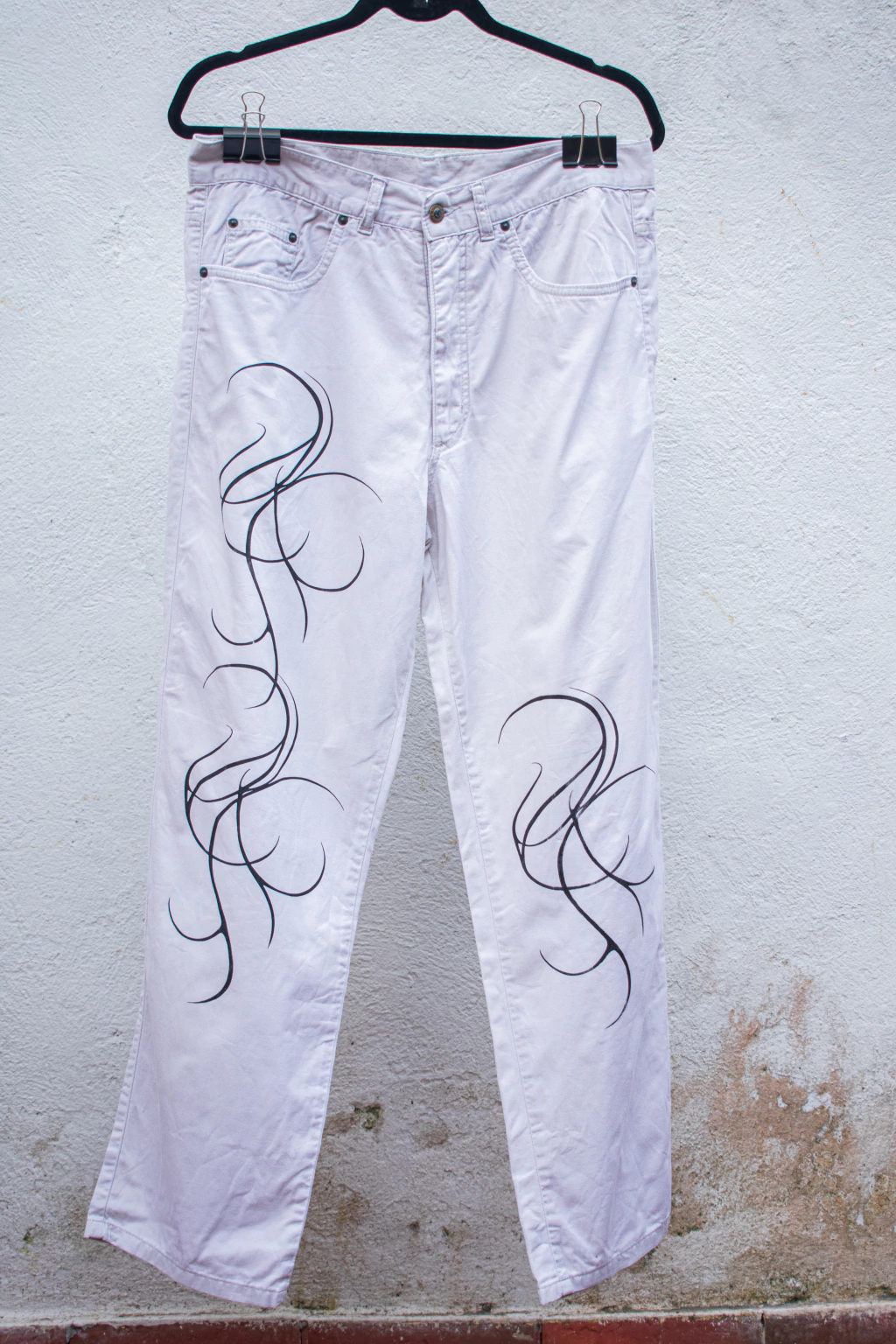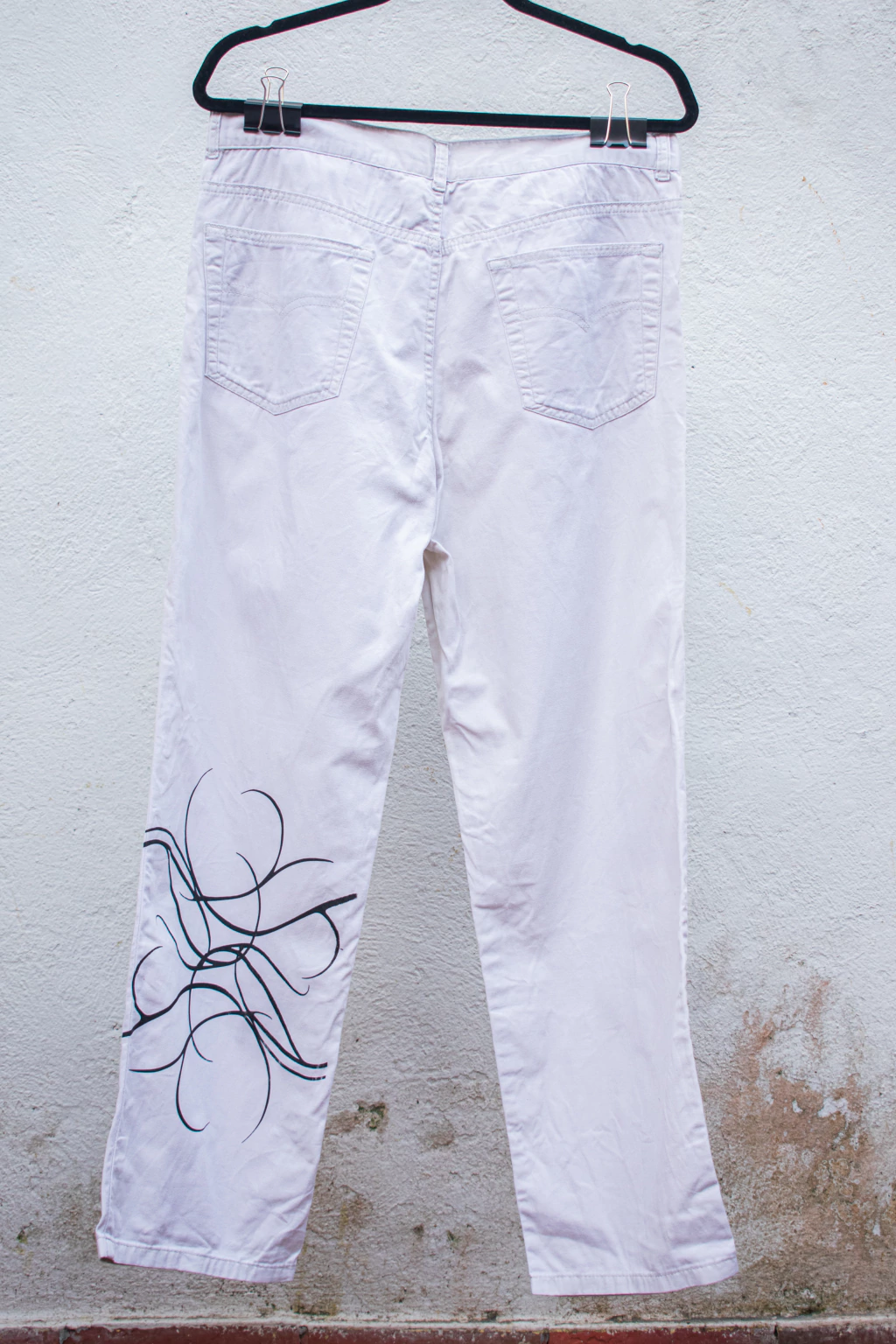 Calça de sarja gelo, cintura média, 100% algodão. Peça vintage estampada com serigrafia.