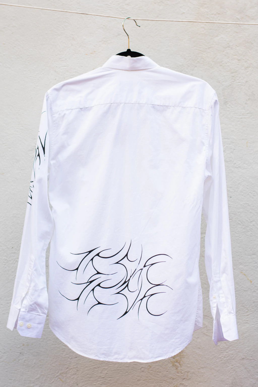 Camisa social branca, 100% algodão. Peça vintage estampada com serigrafia. Modelo veste P. Medidas Ombro: 39 cm Manga: 62 cm Comprimento: 68 cm
