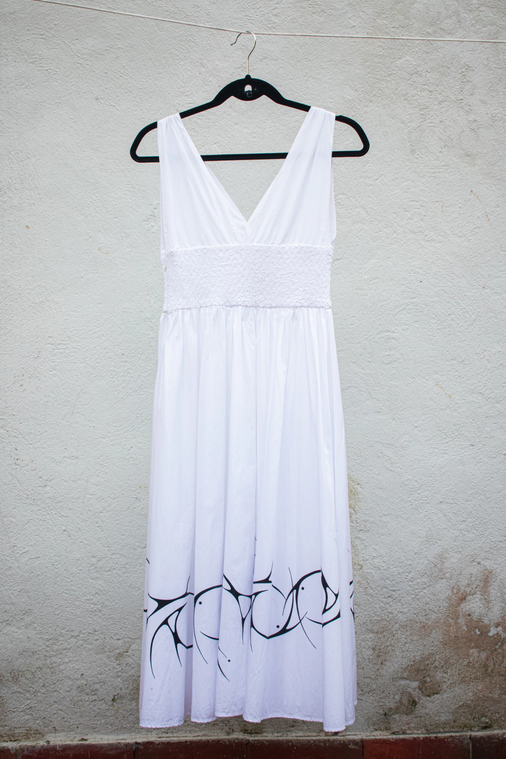 Sobre a peçaVestido branco midi, 100% algodão. Peça vintage estampada com serigrafia. Veste tamanho P/M. Medidas Busto: 31 cm Alça: 25 cm Comprimento: 1,12 m